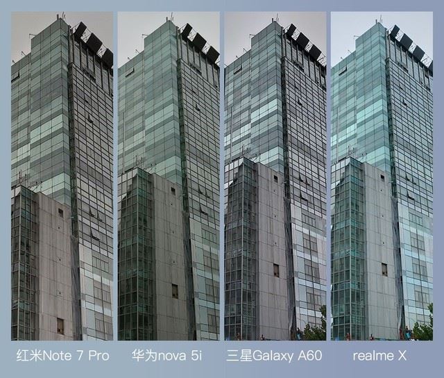 第二张建筑的图又存在差异化了,这一次华为nova 5i和三星Galaxy A60整体画面较为暗淡,红米Note 7 Pro的调教优化了不少,一成不变的是画面亮度较亮,清晰度较高的realme X拍摄的照片。