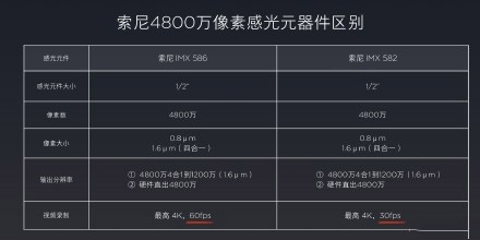 主要的区别在于,在48M Frame rate上,IMX586支持30fps,IMX582支持15fps,IMX582支持4K分辨率30帧的视频录制,而IMX586支持4K分辨率60帧。由于骁龙730的视频录制能力也是最高4K/30帧,IMX582正好符合平台要求。