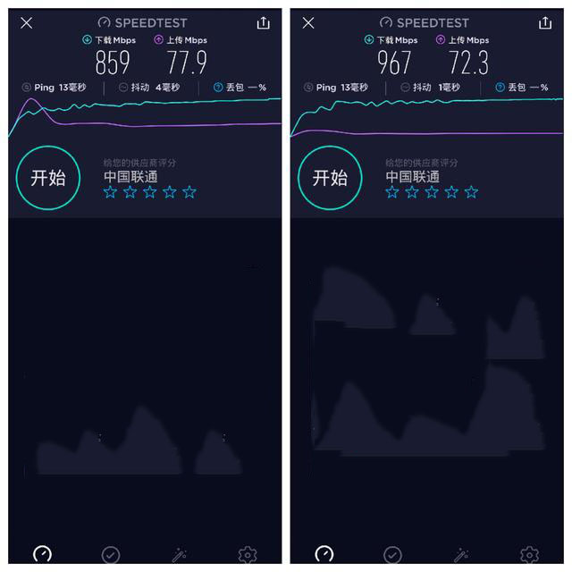 可以看到两次测试结果中,下行频率上有100Mbps程度的波动,不过上行方面则没有出现明显的波动,延迟也一直稳定在13毫秒,整体网络状况非常稳定。