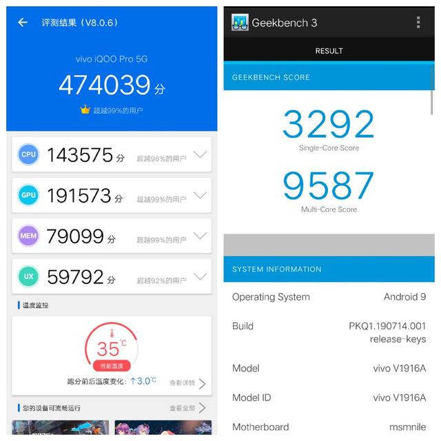 在安兔兔跑分方面,iQOO Pro 5G版跑出了前所未有的474039分的惊人成绩,从数字层面来看可以说是如今市面上当之无愧的性能之王,无人能出其右。GeekBench 3的跑分成绩单线程3292分,多线程9587分也再一次印证了iQOO Pro的强悍性能表现,这也从侧面反映出骁龙855+这颗SoC在性能方面拥有着近乎炸裂般的表现。