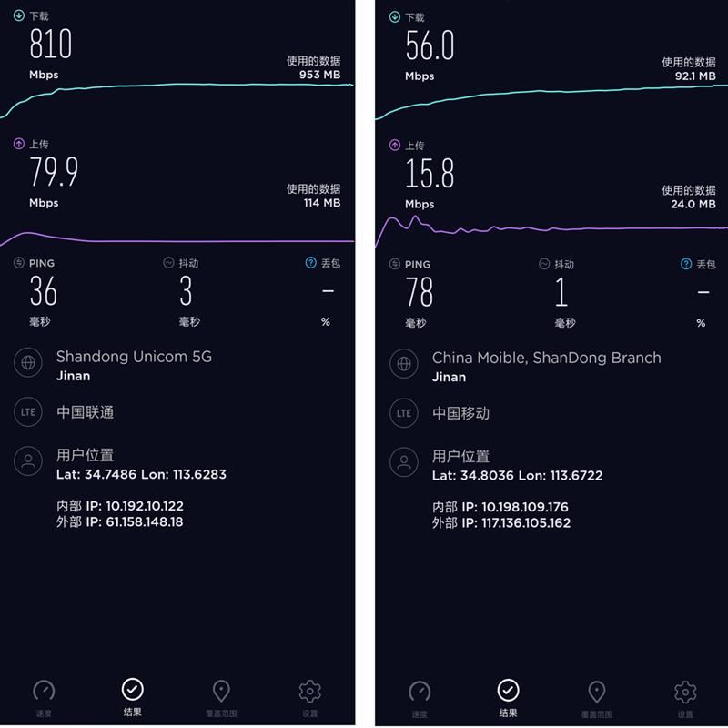如上图所示,左为5G网络环境下测速结果,右为4G网络环境下测速结果。