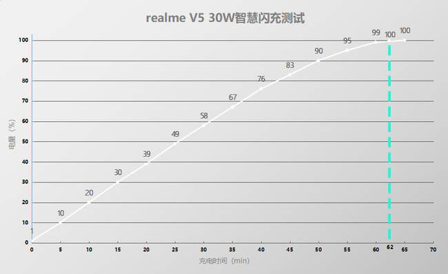realme V5搭配原装30W闪充套装,峰值充电功率可达26.6W+。在手机剩余电量1%情况下开始接入闪充,5分钟时电量已经恢复至10%,中期维持在5分钟充入9%—10%电量的状态,后期充电曲线也没有放缓太多,充至显示100%电量共耗时62分钟,而又过了6分钟之后,充电电流降至0.1A以下,可以认为充电过程完整结束,实测结果与官方数据基本相符。
