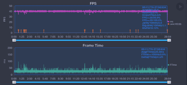 游戏过程我们同时也记录了实时帧率,在如上画质设置前提下,游戏过程一直保持在40FPS满帧左右,平均帧率39.9FPS,大于38FPS的时间占比超过了98.9%,实际体验也是全程保持流畅,刚枪时无需担心realme V5会拖你后腿。