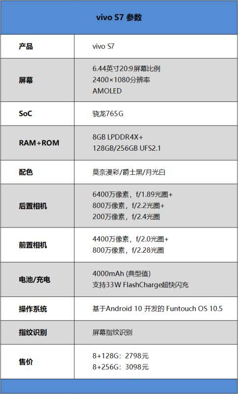 在开始我们今天的评测之前,先来了解一下vivo S7的具体规格参数。