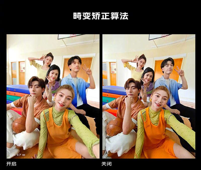 vivo S7通过上文所述的方式将人景分别处理,通过透视投影处理背景畸变,使用球极平面投影处理人脸畸变,基本上消除了边缘人物脸部畸变的问题,从而得到了广角镜头下也比较满意的自拍效果。
