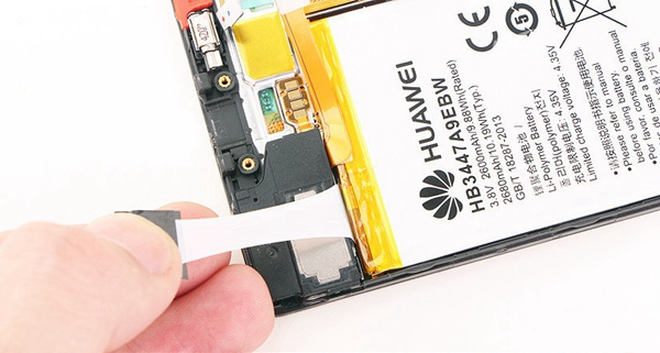 电池方面,华为P8采用了无痕胶的固定方式,只要按照方向拉动无痕胶就能够将底部固定胶去除,这给后期维修和更换电池带来了便利。之前已经在包括苹果,华为,中兴等诸多手机上应用了这种电池固定方式。