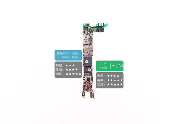 华为麒麟935八核处理器特写+3GB运行内存封装特写。该处理器经过华为的定制能在A53架构的基础上主频达到2.2GHz。
