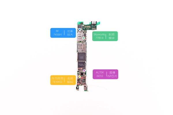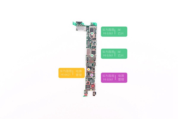 此次华为P8使用了L形主板,这样设计的好处在于能够给电池仓提供更大的空间,并且华为P8在所有关键芯片表面都覆盖了金属屏蔽罩。