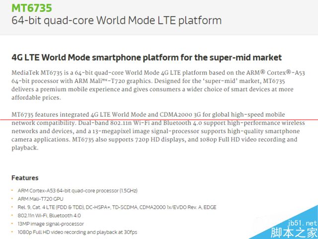 MT6735是一款四核64位处理器,最高主频1.5GHz,支持4G LTE网络,基于ARM Cortex-A53架构,图形处理器为Mali-T720。另外,其支持蓝牙4.0、双频802.11n Wi-Fi,支持1300万像素摄像头,支持最高1080p高清视频录制。
