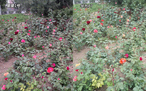 反观华为P7,第一感觉就是整体画面非常苍白,把原本色彩缤纷、争奇斗艳的花圃表现的平平淡淡,花朵大都发生了严重的偏色问题,例如玫红色的花瓣变成了粉红色,另外,近、远处的细节都比较模糊。