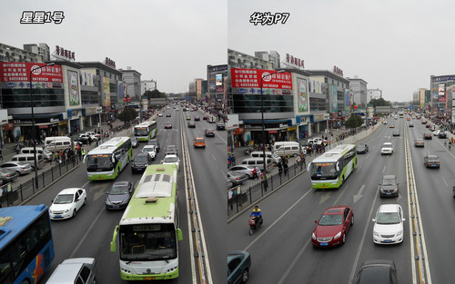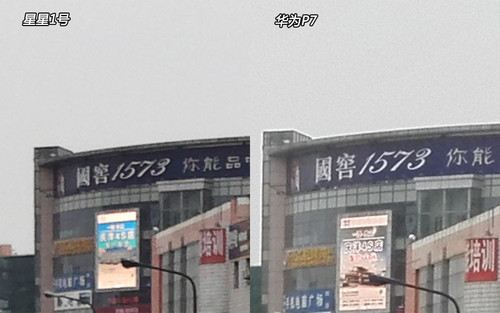 时近黄昏,天色暗沉,两款手机在远景方面也表现出了一些差异。星星1号与肉眼所见的场景更贴近,画面对比度高,看起来更清晰、自然;华为P7强调了亮度,虽然中处的色彩更艳,但还是可以看出整体画面很苍白。