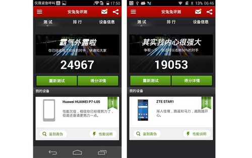 华为P7搭载1.8GHz海思Kirin 910T四核处理器,而星星1号采用的是1.6GHz骁龙400系列处理器,两款手机内建相同的2GB RAM+16GB ROM存储空间。从参数上看,华为P7的配置更高一些,24967分的跑分成绩相较星星1号的19053分也高出不少。