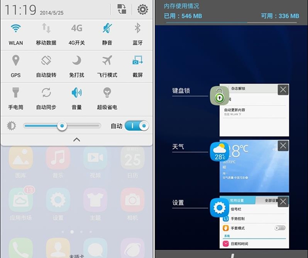 近期任务采用大缩略图模式,支持单个滑动移除和一键清除。需要注意的是,近期任务并非长按HOME键调出,而是长按最右侧的“菜单键”。
