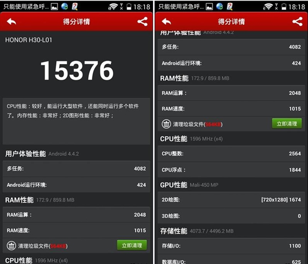 实际结果一悲一喜,悲的是Kirin 910的安兔兔跑分并没有MT6582更高,甚至低了1000分左右,有些让人小小的失望;喜的是通过图形芯片由Mali-400升级到Mali-450,图形性能测试软件NenaMark 2跑分整整提升了10fps,因此在游戏性能方面并不会落后。