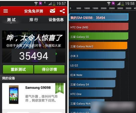领世旗舰G9098配备2.3GHz高通骁龙MSM8274四核处理器,搭载2GB内存和32GB存储空间。性能表现如何,不妨看看下面的具体测试结果。