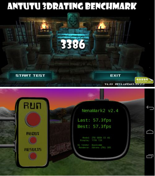 安兔兔3D测试:3386分和NenaMark2测试:57.3帧的成绩,可以基本满足大型3D游戏的运行。