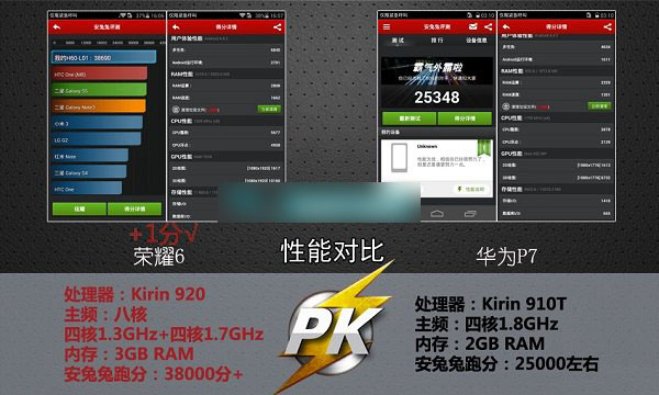 华为荣耀6采用华为最新的海思麒麟920八核处理器,运行3GB大内存,通过安兔兔跑分软件测试,可以看到荣耀6安兔兔跑分超过3.8万分,可以说是目前跑分最高的一款手机。而华为P7采用的是1.8Ghz的海思Kirin 910T处理器,运行2GB内存,通过安兔兔跑分软件测试的得分在2.5万分左右。