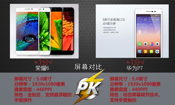 华为荣耀6和华为P7均采用的是5英寸1080P全高清屏幕,另外两者在全贴合屏幕、支持悬浮触控、手套模式等方面基本相当。