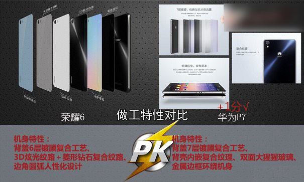 华为荣耀背盖采用6层镀膜复合工艺、3D炫光纹路+棱形钻石复合纹路、边角圆弧人性化设计等。而华为P7采用7层镀膜复合工艺,背壳内嵌符合文理,双面打星星玻璃以及金属环绕机身设计。