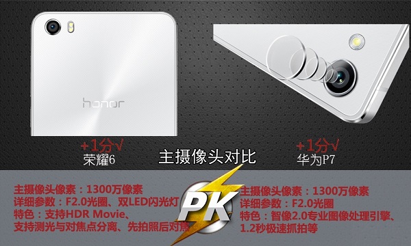 华为荣耀6和华为P7均为后置1300万像素主摄像头,两者均为F2.0大光圈镜头。不同的是荣耀6采用双LED闪光灯,支持HDR,支持先拍照后对焦。而华为P7采用智像2.0专业图形处理引擎,具备1.2s极速抓拍等特点。