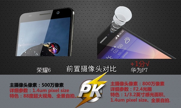 如今智能手机的自拍功能也是不少用户关注的面之一。华为荣耀6前置500万像素88度广角摄像头,支持全景自拍。而华为P7前置了800万像素前置摄像头,具备日1/3.2英寸感光面积,支持全景自拍。