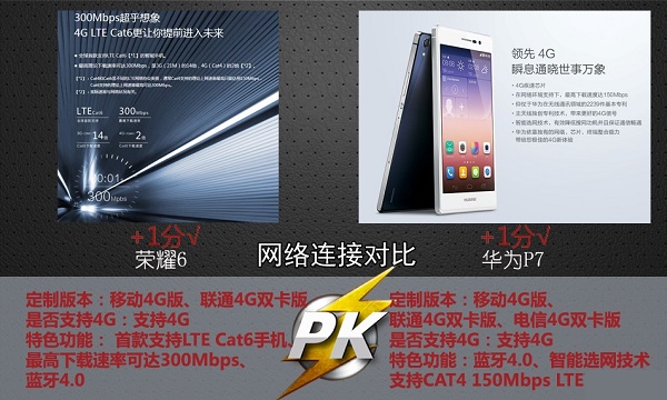 网络方面,荣耀6拥有移动和联通4G版,其中联通版采用双卡版本,另外荣耀6是全球首款支持LTE Cat6的手机,最高下载速率可以达到300Mbps。而华为P7也支持4G网络,同样拥有移动和联通版,只是传输速率没有荣耀6高。
