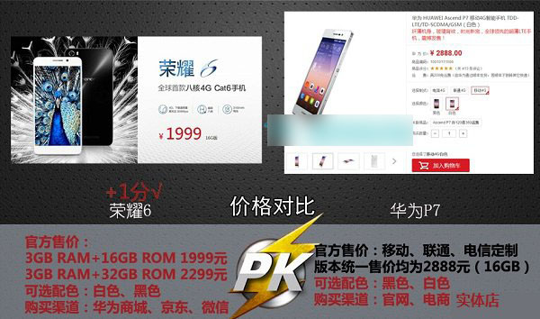 华为荣耀6拥有两个版本,其中16G版1999元,32G版2299元,而华为P7仅有16GB版本,售价2888元。