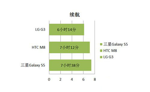 LG G3标配一个3000mAh电池,这对于它强大的配置和超高分辨率来说肯定不算够用。经过笔者的综合电池续航测试显示,它确实也只坚持了6小时14分钟。虽然这个成绩与其他的旗舰机比如三星GALAXY S5相比不算出彩,但是总的来说,一天一充也几乎是所有旗舰级别手机的惯例,稍微少那么1个小时左右的时间无伤大雅。