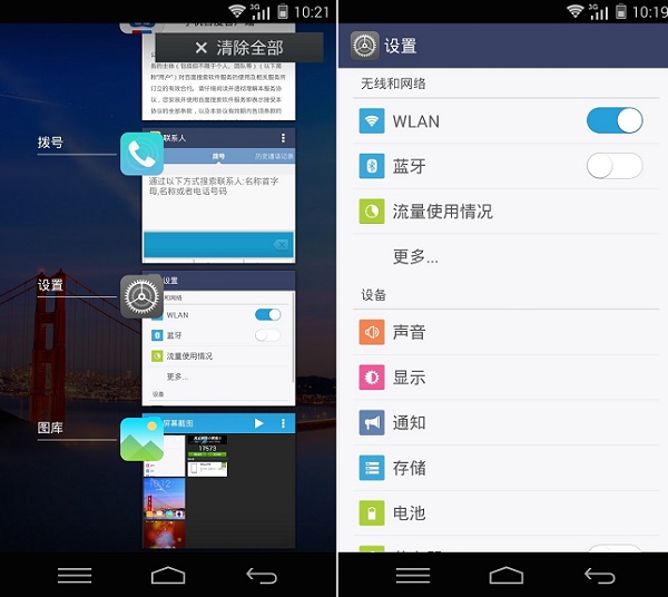 富可视M512系统的屏幕解锁方式依旧是滑动式,不同的是在触摸屏幕解锁时会跟随手指的滑动轨迹产生动画效果。系统的整体设计延续了之前扁平化的风格,Android系统自带的例如后台、多任务管理器、桌面设置、手势操作等功能都可以在富可视M512身上找到,功能上还是很全面的。