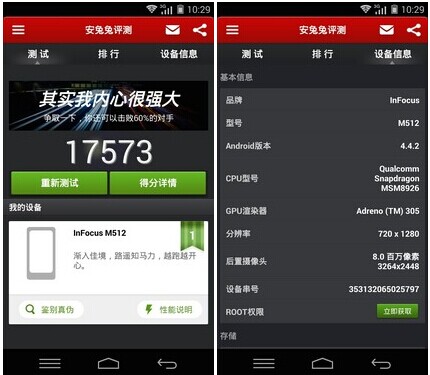 富可视M512安兔兔跑分成绩超过了1.7万,相比此前热销的,跑分为1.6万分左右的富可视M310手机,性能要更出色一些,不过依旧属于中低端性能水准。另外富可视M512处理器中内置的Adreno 305 GPU图形核心,能够支持1080P视频解码,也就是可以流畅1080P全高清视频的播放。