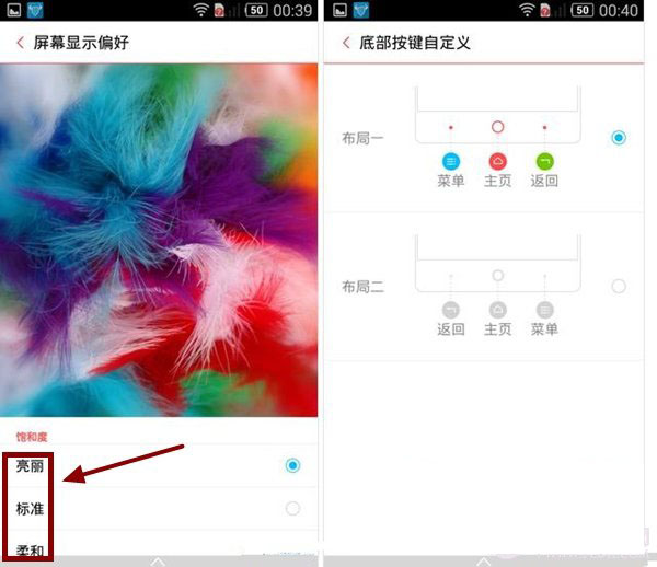nubia Z7 mini系统设置有较高的自定义性,第一:大家对它可以针对屏幕显示偏好进行相关设置,可以设置亮丽、标准、柔和三种不同的饱和度效果。第二:我们也可以针对 nubia Z7 mini的底部触控按键功能进行相关自定义。比方,假如我们不喜欢看到返回键在界面最右边,那么我们就可以把返回键放到最左边。这点很人性化有木有?