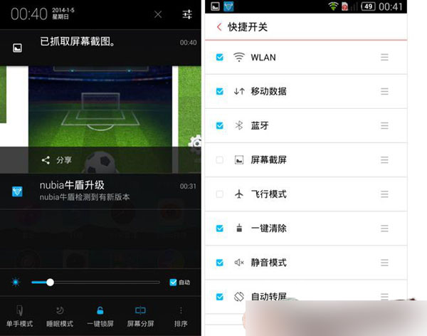 nubia Z7 mini同样也集合了一些采用的快捷键,比如大家常用的有WIFI、蓝牙、数据业务、GPS、屏幕亮度调节等等开关同时,我们也可以对这些快捷开关的顺序进行调整,也可以将不常用的快捷开关给隐藏掉,将常用的快捷开关给显示出来。