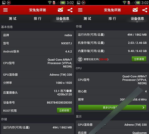 nubia Z7 mini搭载了目前比较主流的高通晓龙801四核处理器处理器,默认主频达到2.0GHz,骁龙801还集成有一颗Adreno 330构架,GPU主频为578MHz。就性能而言,,以下我们通过最常用的安兔兔跑分软件才测试下nubia Z7 mini的跑分情况。