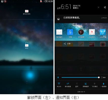 解锁界面,符合人体习惯,从底部向上滑动。快捷设置和通知中心上下对称,方便用户使用。