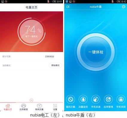 nubia UI2.5版本最玩味的设计在于它的另类功能,比如nubia 电工和nubia 牛盾。其实,就是省电模式和安全软件。这样的名字设置,让人倍感亲切。