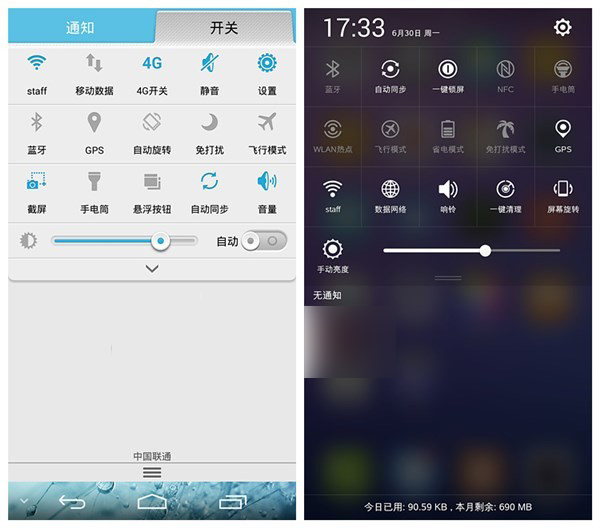 再来看看一加手机的下拉菜单,一加的Color则是采用的是像毛玻璃一样的设计,这样给我们带来的是视觉方面的享受,但是遗憾的是,一加不想荣耀6那样提供一个4G开关,这点有点缺陷哦。