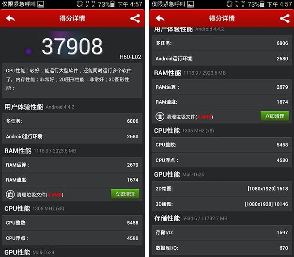 就性能上而言,荣耀6搭载了1.7Ghz海思麒麟920八核处理器,运行3GB大内存,通过安兔兔跑分软件测试,其得分达到了3.8万高分,安兔兔跑性能跑分第一,性能上已经可以媲美最知名的高通801四核处理器,如下图所示: