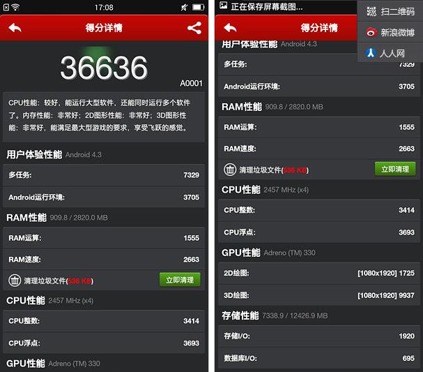 因此就性能而言,荣耀6的综合性能要明显强于一加手机,一加手机的性能足以满足各类大型应用、1080P全高清视屏等,性能彪悍,华为荣耀6跑分性能非常不错,还是强悍与一加手机。