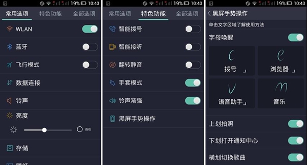设置“界面分为三个标签管理,亮度调节的设计非常人性化,更给力的还要说“黑屏手势操作”:只需在屏幕上划出一个“M”即可,如果想切换歌曲,只需轻轻横划即可,非常方便。