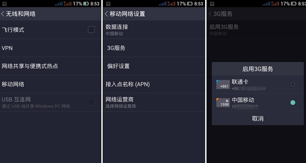 因为是双卡双待,所以插入电话卡即可分别打电话,之间互不影响。不过移动、联通之间的3G切换起来略显麻烦,点击“数据连接”时,会弹出“注意”窗口。需要你再到“无线和网络”的设置选项中找到“3G”来切换。过程如下: