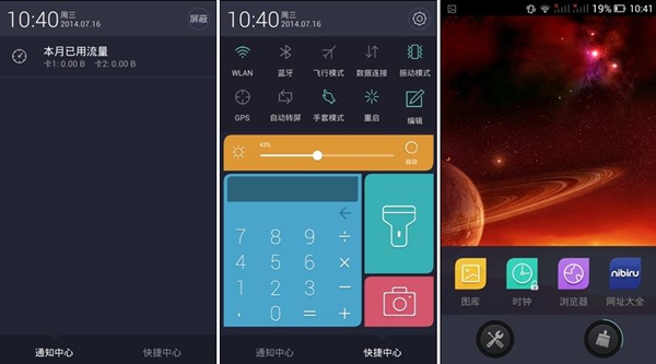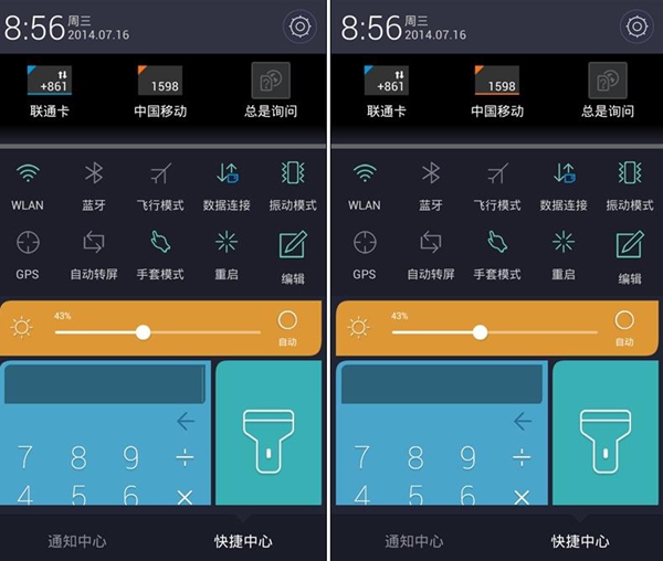 下拉列表分为两部分,分别是“通知中心”和“快捷中心”,快捷中心的设计别具一格,它将比较常用的计算器、手电筒和相机整合在开关下面,既充分利用了空间,也节约了用户寻找相应的时间。计算器可以直接使用哦。