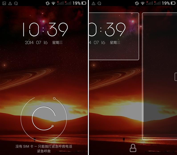 锁屏界面是不停逆时针旋转的两段圆弧,拖动内圈到外圈边缘即可解锁。