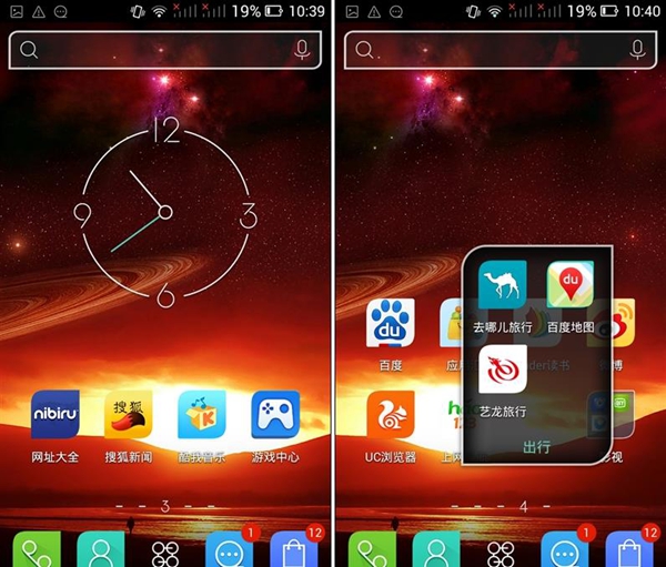 Touch OS的图标很是奇特,采用了独特的叶状图标,扁平化设计。可以看到,除了系统图标外,一些第三方图标也被重绘,而且像UC浏览器、去哪儿旅行等图标处理的还比较美观。1.0版本未曾美化的微博图标这次也被重绘,与整个桌面更加的协调。