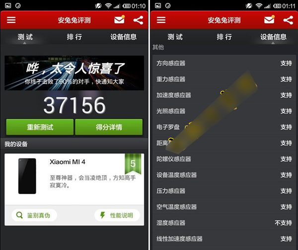 安兔兔跑分为37156分,这也是主频2.5GHz骁龙801的正常水平。在整个手机业界均在采用这几家上游供应链时,小米4在配置参数上,已经很难再玩出花样,这也是小米4转而追求设计和体验的原因之一。当然,不能说跑分最高的手机,但成为之一是完全没有问题的。