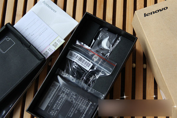 打开联想黄金斗士A8的包装盒,我们看到附送的配件有电源适配器、数据线、保修卡、说明书,还有一块电池(手机中没装电池),和其它的智能手机没有什么区别,没有特别的配件附送。