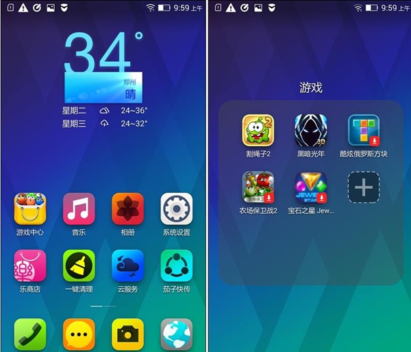 通过与联想黄金斗士S8对比,A8的桌面图标有了一些重新绘制,相比先前更显通透轻薄。底部Dock的效果也被取消,桌面的一体性更加明显。而这些效果的体验是因为A8系统取消了二级菜单,桌面图标采用文件夹管理,从图中可以看出有些应用有下载的提示,这是因为集成了乐商店的原因,可以看得出来,联想在生态方面的理念意识是大为加强了。