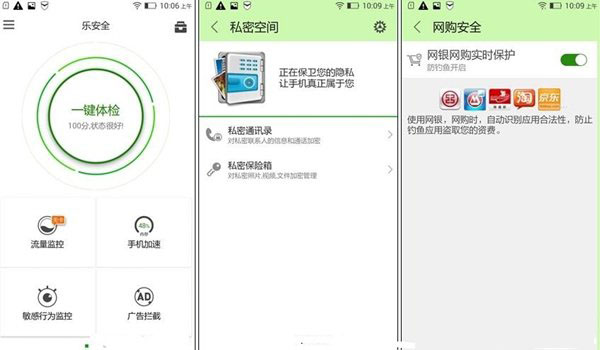 联想黄金斗士A8还提供了“乐安全”软件,提供了“流量监控”“手机加速”“私密空间”“网购安全”等多项安全功能,洁癖症者完全不必下载第三方安全软件。而这些手机自带的软件一般联想所以的智能手机都有这些安全功能。这点虽然是不错的,但是对于一些用户不喜欢绑定一些软件来说有点厌恶。