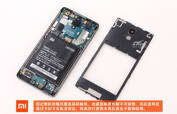 图为拆解下来的小米4后壳内部的中框特写,其机身内部固定中框的螺丝上贴有易碎纸,意味着一旦拆机,小米4将失去免费保修服务。