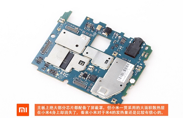 图为拆解下来的小米4主板特写,主板上绝大部分芯片都配备了屏蔽罩,但小米一贯采用的大面积散热层在小米4身上消失了,看来小米对于米4的发热控制还是比较有信心的。