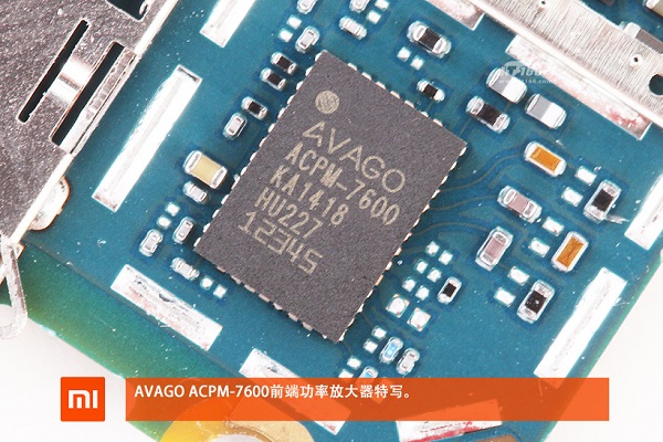 图为小米4主板上内置的AVAGO ACPM-7600前端功率放大器特写。